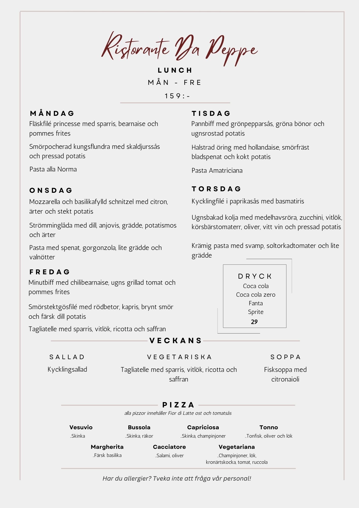 Vi är din destination för äkta italiensk mat och gästfrihet. Från färsk pasta till läckra pizza, erbjuder vi en omfattande meny med klassiska rätter tillagade med passion och kärlek. Hos oss får du inte bara god mat, utan även en varm och inbjudande atmosfär där varje besök blir en speciell upplevelse. Vi ser fram emot att välkomna dig till vår restaurang för en smakresa genom Italien!